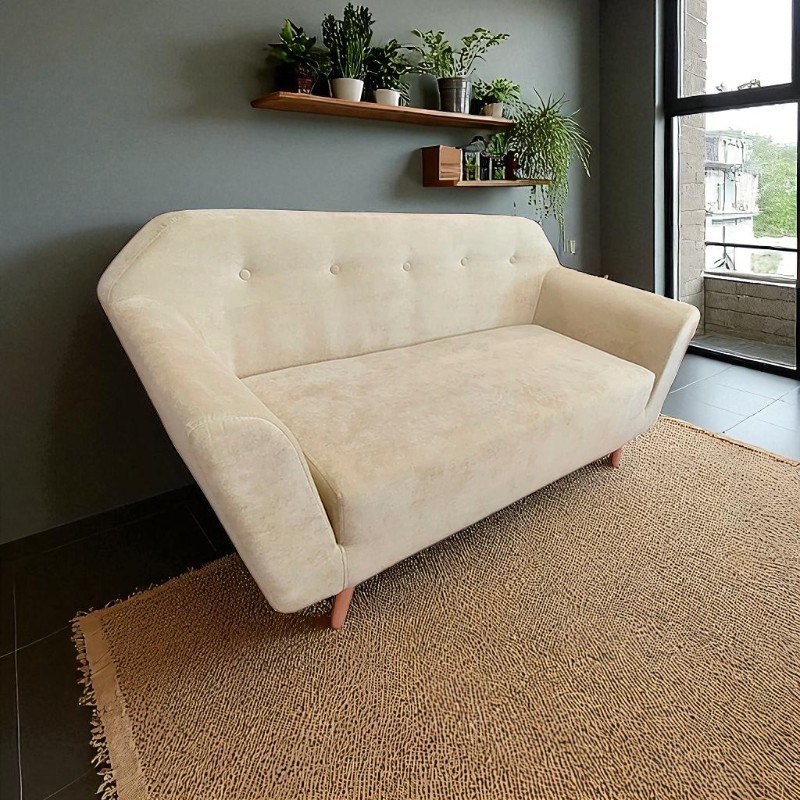 Sofá de línea escandinava: almohadón de respaldo con detalle en capitoné integrado a la estructura y dos almohadones de asiento en placa soft marca Piero.