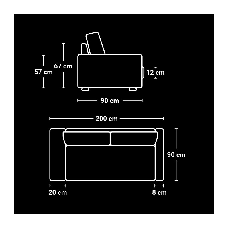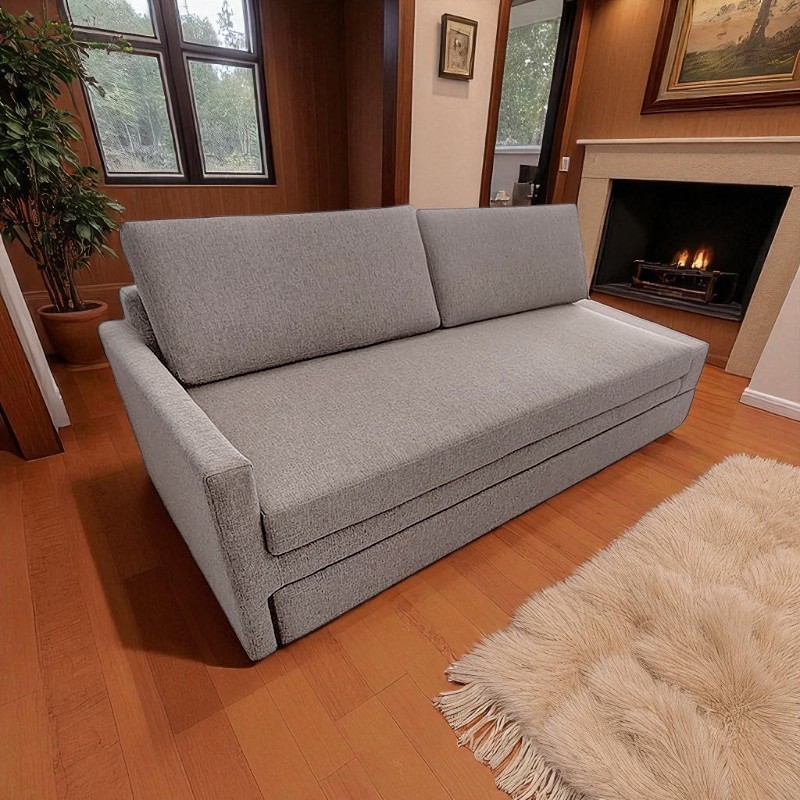 Sofá cama con marinera incluída, con dos almohadones de respaldo con placa hiper soft y un almohadón de asiento en placa soft, ambos de marca Piero. Con diseño de apoyabrazo extra fino de un sólo lado. Colchón cama auxiliar medidas, 1.90 x 0.80 x 0.14 m.