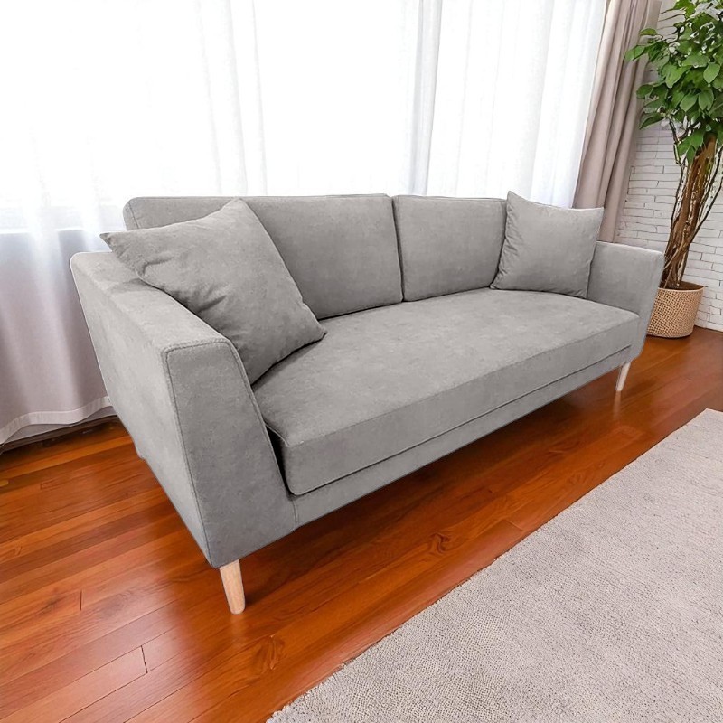 Sofá de línea escandinava. Con dos almohadones de respaldo en placa hiper soft, ambos de marca Piero. Sus apoyabrazos se encuentran levemente inclinados. Incluye dos almohadones decorativos.